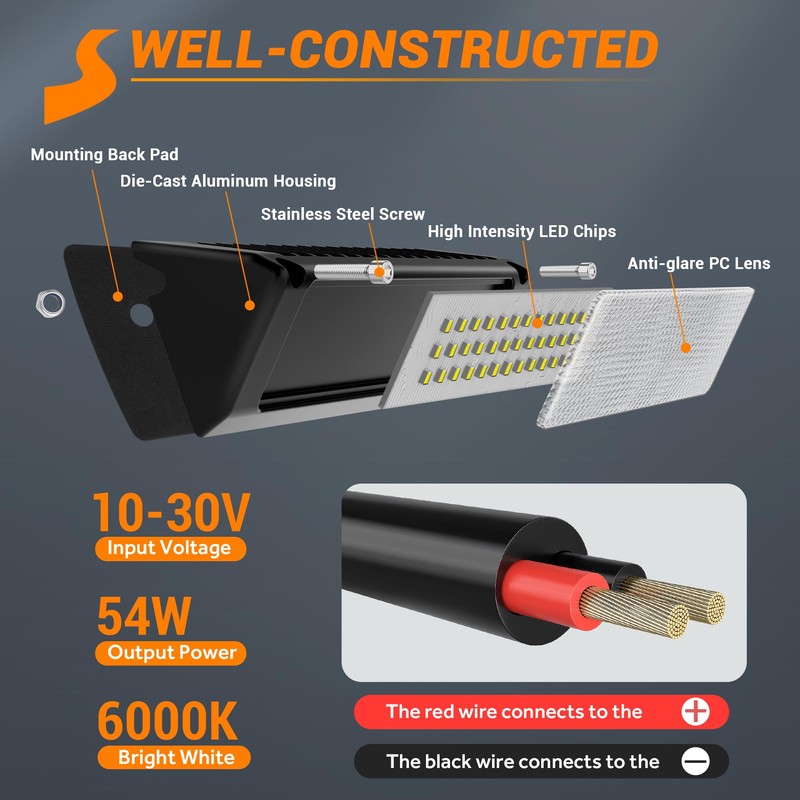 - Exceptional Brightness: 54W output, features 36 high-brightness LEDs, emitting 2000LM in a clear 6000K white light. Anti-glare PC lens ensures comfortable, dazzling-free illumination. The spread irradition range of RV lights exterior are 65 degree in horizontal spread X 69 degree in vertical to avoid falling and injury in the visual blind area, farewell to the darkness