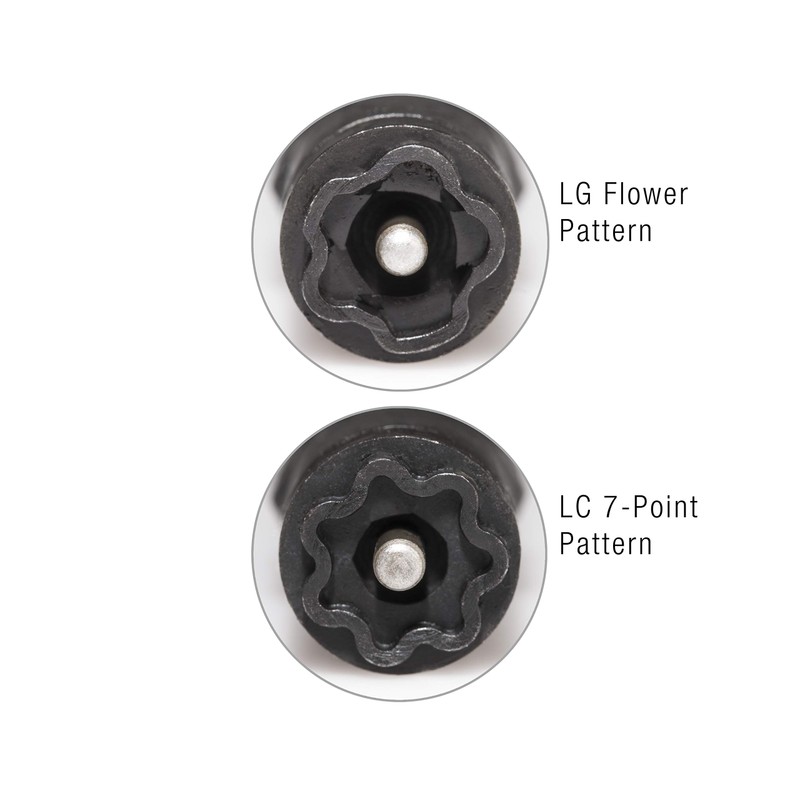 The SSK-75 star key has a LG flower pattern on one side and a LC 7 point star pattern on the other, and is designed to be used with our SSK-716 Star Key Can Wrench.