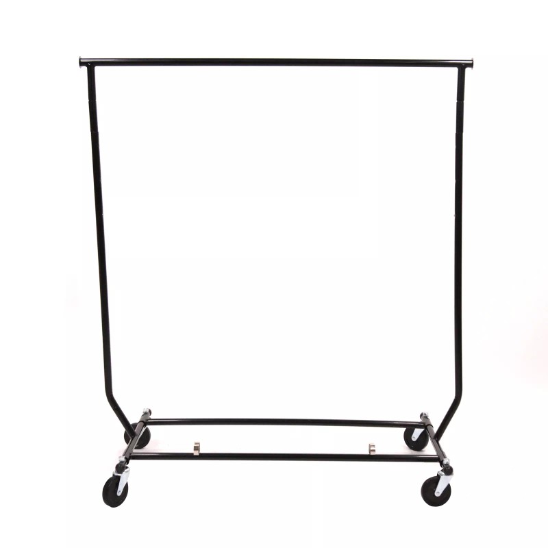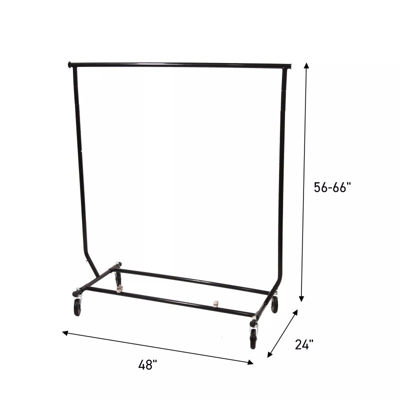 The Black Single-Rail Collapsible Salesman Rack is a great solution for temporarily overstocked items. Whether you are using them for seasonal items, clearance, or keeping your stock room organized, the rolling racks get the job done. They fold up flat, so they can easily be stored away, and they can easily be set up when needed for use. Measuring 48"W x 24"D x 56-66"H, these rolling clothing racks are the perfect size for hanging garments. Featuring 4'' industrial casters, the clothes racks are completely reliable regardless of where you're wheeling it. It's easily stored and there's no assembly required. Overall weight capacity is 250 lbs on this EZ fold clothing rack.