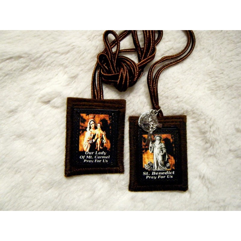 1. This is a Quality Made 100% Wool Catholic Church Approved Brown Scapular that Honors St. Benedict as the Father of Western Monasticism. He is the Patron Saint of Europe and of a Happy Death, and the Holy Father of the Benedictine Order. What would Western Civilization look like without St. Benedict? It is Impossible to say but for more than one thousand five hundred years Monks across the World have carried on his great work forever living his directive , that in all things God May Be Glorified. This Scapular comes with 3 Small Pendant Medals, A Miraculous Medal, A St. Benedict Medal and a Crucifix Medal. The 100% Wool Pieces are 2 " X 1 1/2"  and the Stings size is 18" between the wool Pieces although you can message me if you need shorter or longer strings. Each Scapular comes with a Brown Scapular Pamphlet explaining the Brown Scapular and I put in each order an Enrollment Pamphlet with the Prayers for an Enrollment. You take the Pamphlet to a Priest if you or a family member needs to be enrolled and chances are a Priest will enroll you on the spot. All my Scapulars Ship Fast and Free!