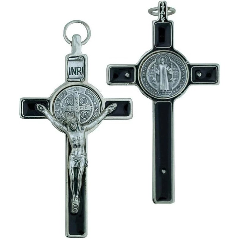 St. Benedict Crucifix with Round St. Benedict Medal Inlay with 3" Silver-Tone