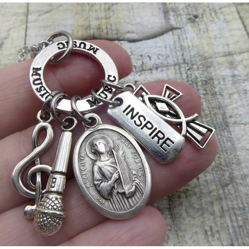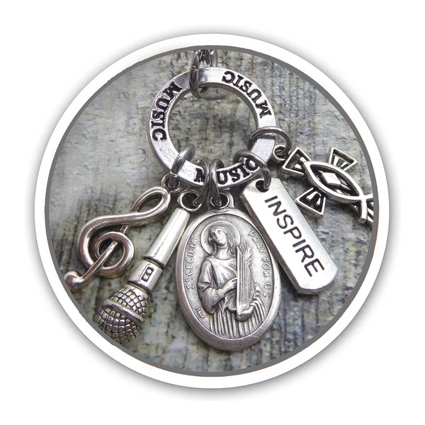 St. Cecilia, Patron Saint of Musicians, Singer Keychain, Clip or Necklace. Divine Messenger, Inspiration and Help. Customize with Initial or Birthstone Crystal Option, Unisex Gift.