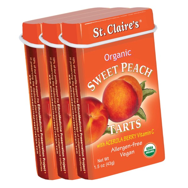 St. Claire's Organic Fruit Tart Candies, (Sweet Peach, 1.5 Ounce Tin, Bundle of 3) | Gluten-Free, Vegan, GMO-Free, Plant-based, Allergen-Free | Made in our Allergen-Free facility