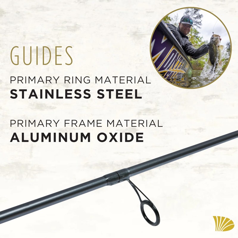 - GUIDES: Stainless Steel primary ring material & Aluminim-Oxide primary frame guides; Nylon reel seat primary material; Aluminum primary nut material & stainless steel secondary nut material