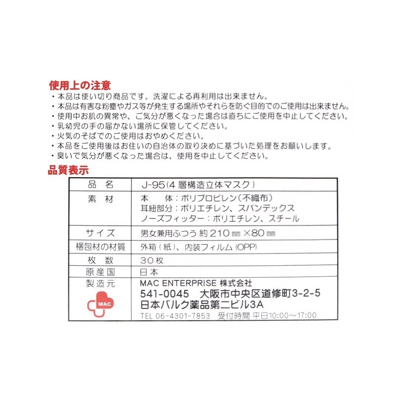 4層構造の3D立体型で、厚みがありしっかりとしています。 - 人気の高かった、前モデルのJN95を改良したモデルで、医療用クラス3、JIS規格適合[JIS T 9001]となり、より安全性が示されました。