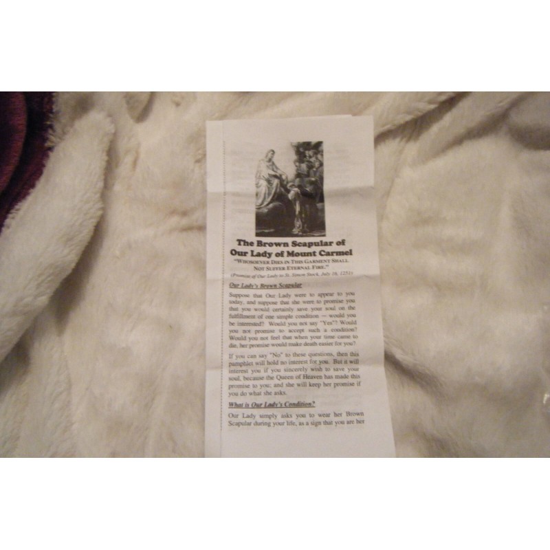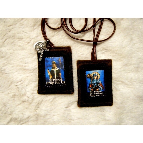 This is a 100% Wool Quality Made Long Lasting Brown Scapular that Honors Saint Patrick A Patron Saint of Ireland on one end and St. Brigid, the only Woman Patron Saint of Ireland on the other end. Saint Patrick was a Fifth-Century Romano-British Christian Missionary and Bishop in Ireland. Known as the "Apostle of Ireland", he is the Primary Patron Saint of Ireland, while St. Brigid is the Only Woman Patron Saint of Ireland.  Brigid was venerated as “Mary of the Gael,” a Saint for Women, Shepherds, Beggars, Refugees and those in Childbirth. Her feast day, February 1,  In 2022, the Irish government finally acknowledged Brigid’s importance by declaring a new National Holiday on her Feast Day of February 1.