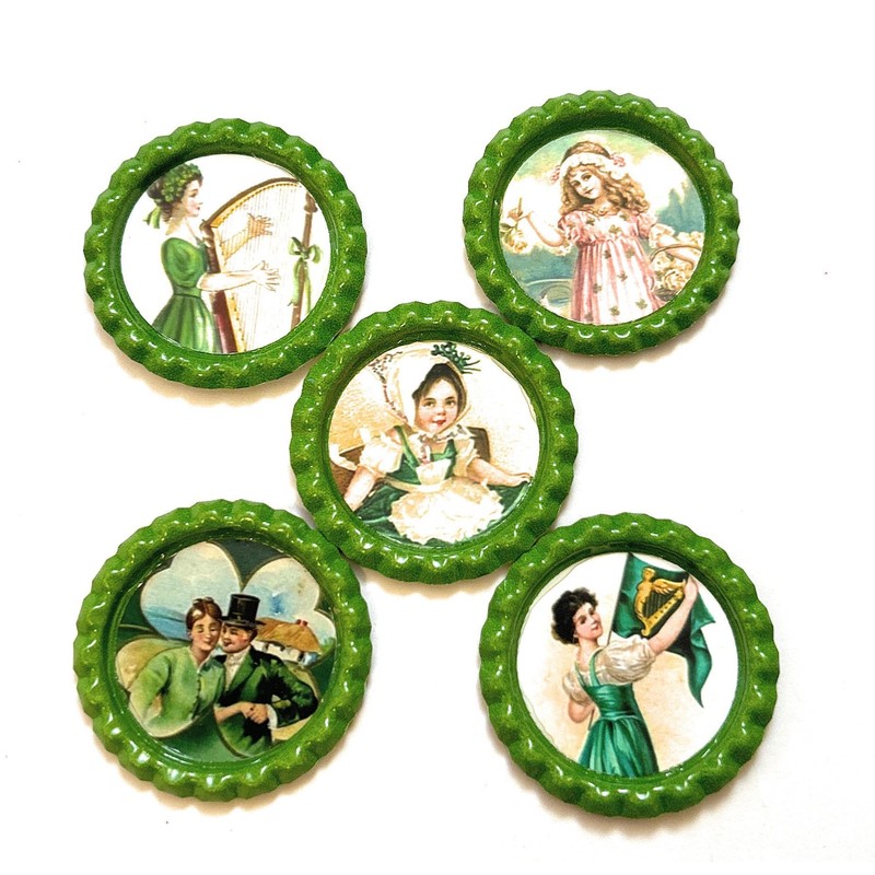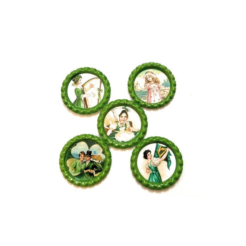 Handmade Bottle Cap Magnet Set, Made of 5 1" in diameter chrome bottle caps with a added image printed up on glossy photo paper and topped with diamond glaze and added to a strong button style magnet. You will recieve your set choice