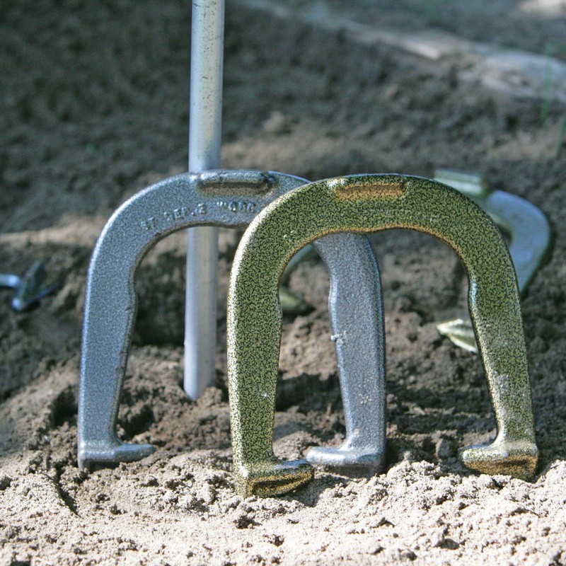 - Features. Includes 4 solid steel horseshoes with a baked-on, non-slip finish that is electrostatically applied. Finish is more resistant to chipping, corrosion and weathering than other coatings.