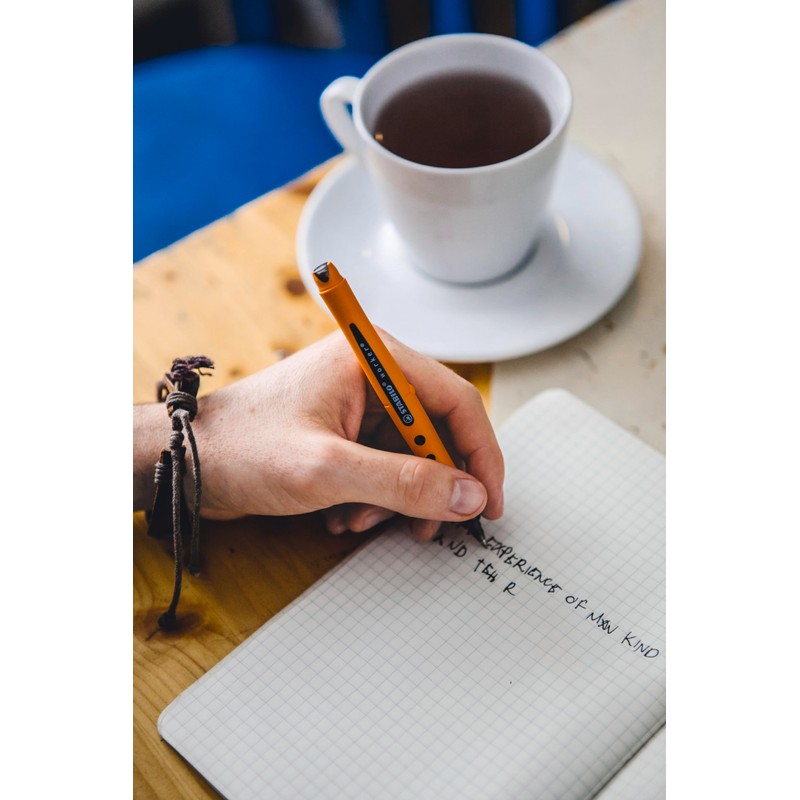 Rollerball STABILO® worker® medium. Kappenmodell. Typbezeichnung der Mine: Rollerballmine. Art der Schreibflüssigkeit: Tinte auf Wasserbasis. Ausführung Mine: Edelstahlspitze für ein extrem sanftes Schreibgefühl. Die unverwüstliche Spitze gleitet rasant über das Papier, 0,5 mm, schwarz. Kann einige Tage offen liegen bleiben, ohne einzutrocknen. Tintenspeicher-Technik: Free Ink System. Ausführung Stift: rutschfeste Oberfläche aus Polypropylen, im ergonomischen Design. Material des Clips: Metallclip. Mit Tintenstandkontrolle. Farbe des Schaftes: orange.