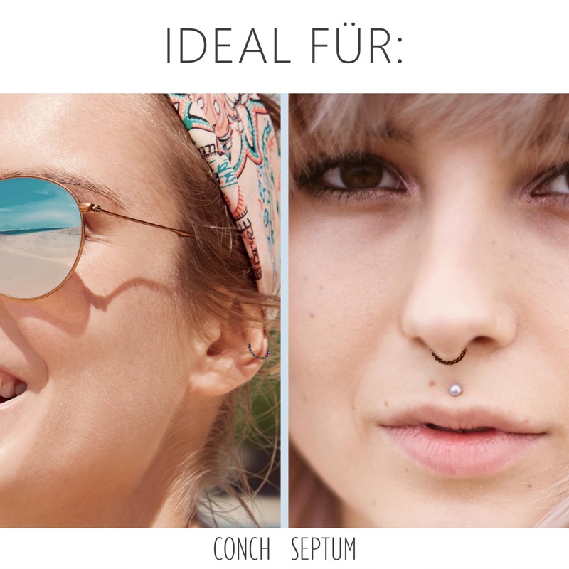 - Can be used for eye brown, conch, daith, eskimo, ear, nose piercing, nipple, rook, septum, snug, tragus and genital piercing.