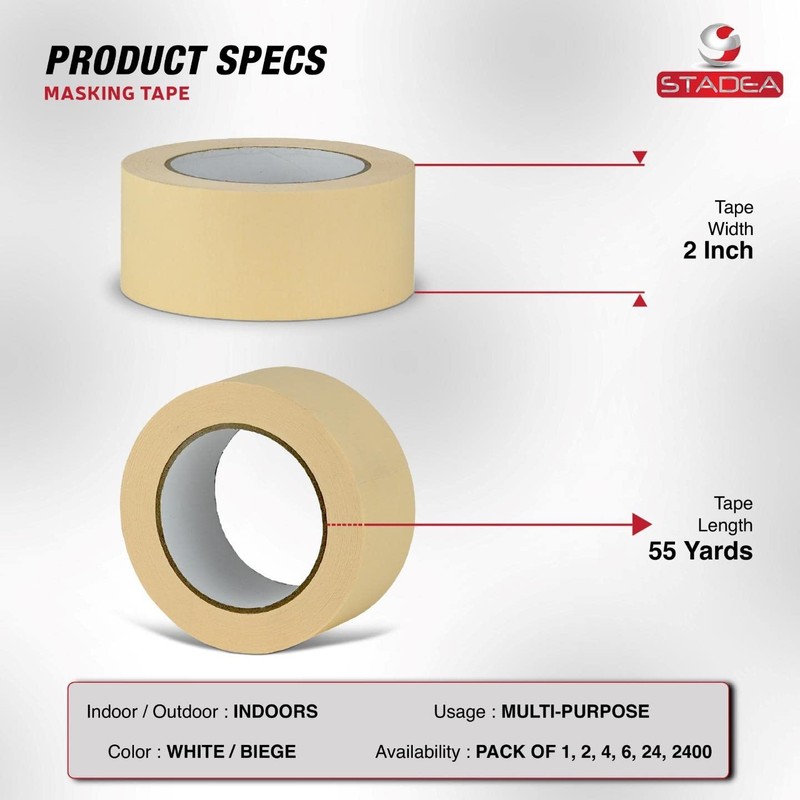 - ➤ 2 INCH WIDE MASKING TAPE : Stadea Series Super A, 2 Inch wide, 55 Yard long masking tape made of strong crepe paper, and glue with excellent adhesion on multiple surface - Pack of 24