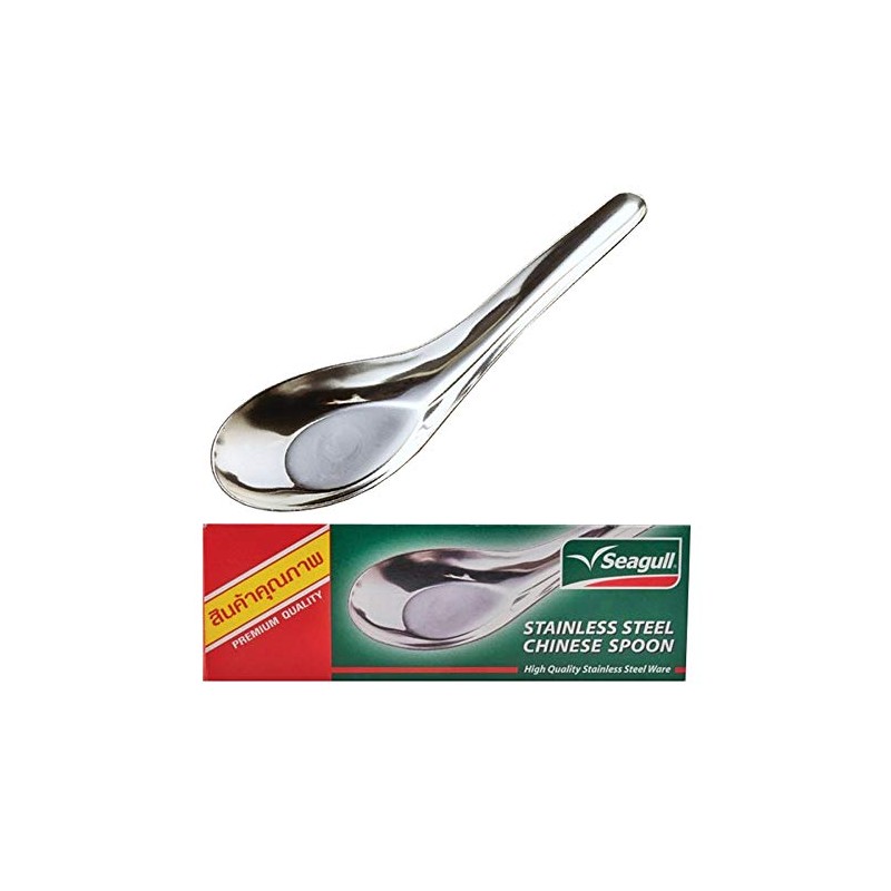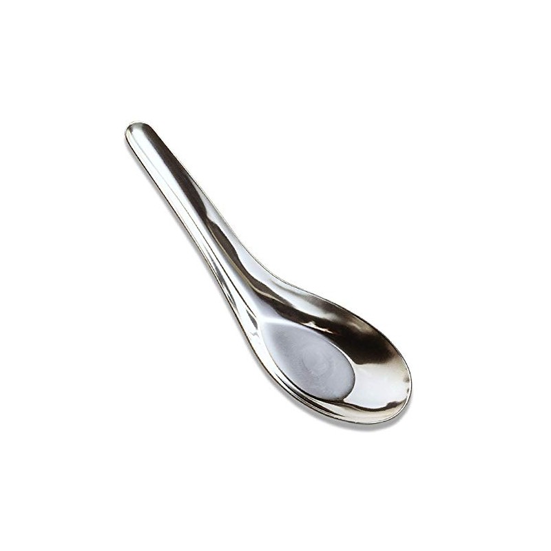 Stainless steel Chinese style soup spoons for sipping soup or serving bite sized appetizers in! This is a box of 12 spoons, all dishwasher safe and measuring 5 inches long.
