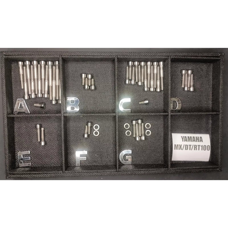 YAMAHA MX100/DT100 (1974-1983) and RT100 1990-2000 This kit contains all the screws,nuts, washers, and bolts on the exterior of the engine. All bolts/nuts HAND polished stainless. this kit is all socket allen for ease of use.. all allen heads have knurls removed. kit includes: