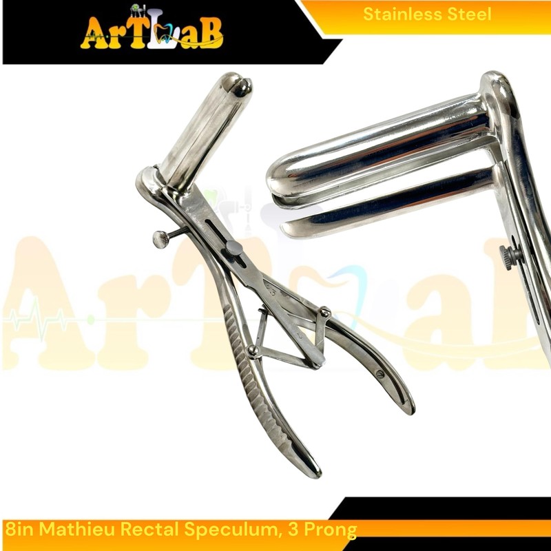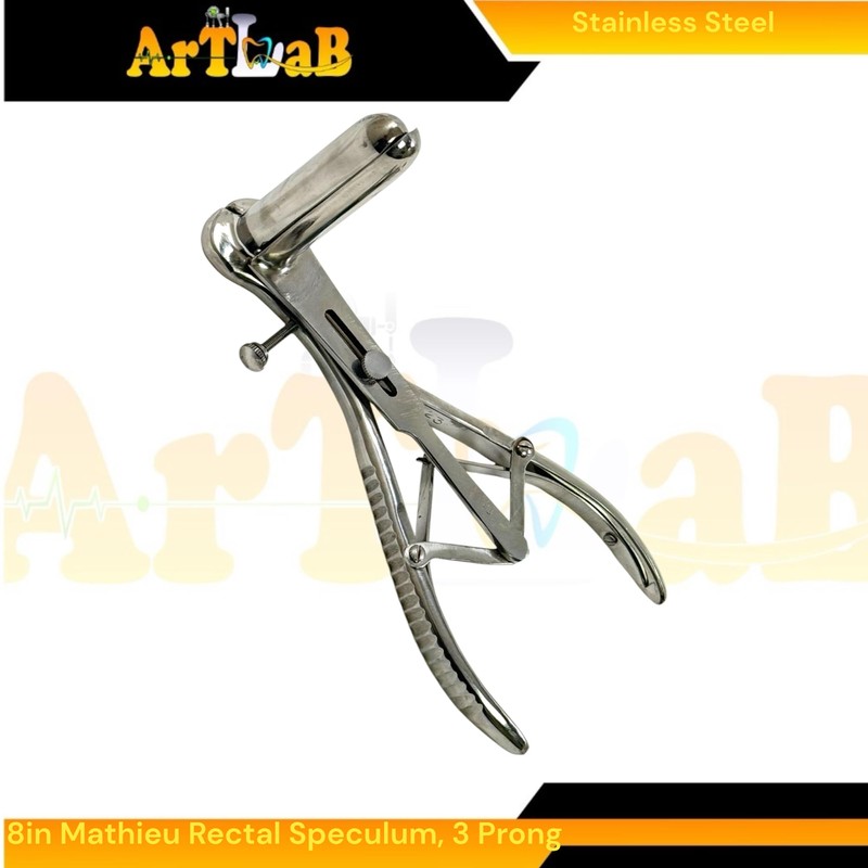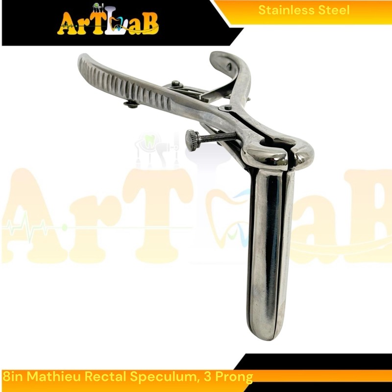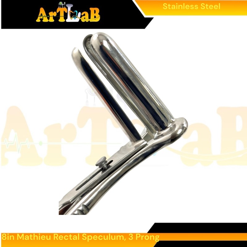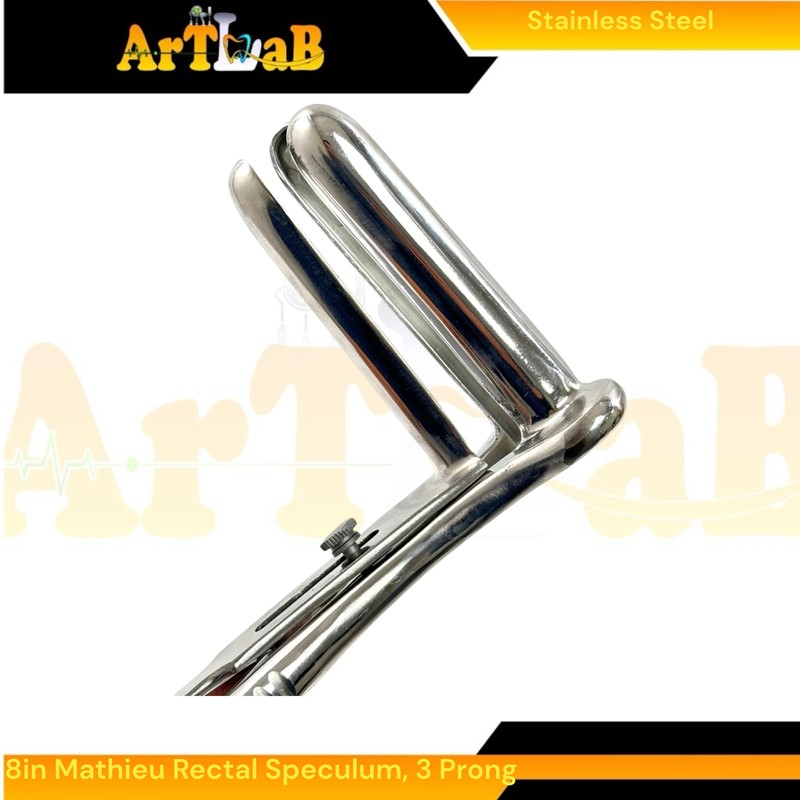 Stainless Steel 3-Pronged Mathieu Speculum 8in Long, Large Size, Examination Instrument Specula - Autoclave Safe - Locking Screws & Leaf Spring Handle