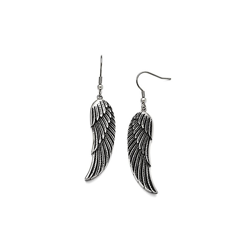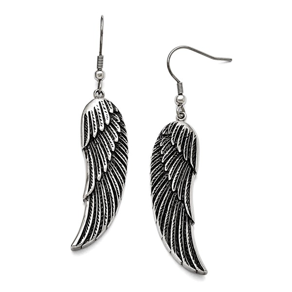 Stainless Steel Antiqued and Polished Wing Dangle Shepherd Hook Earrings