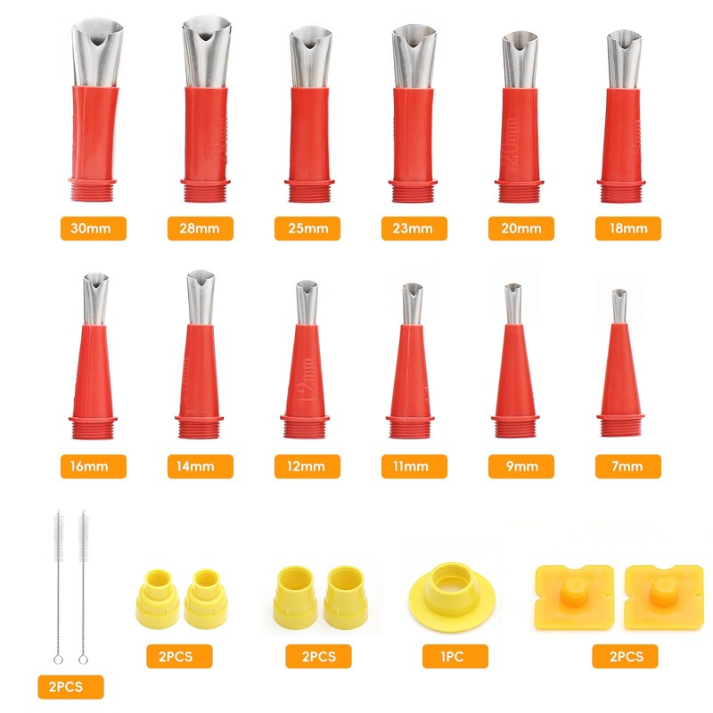 - 【Meticulous Combination】Stainless steel caulking nozzle kit contains 12 different sizes of caulking nozzles to meet all kinds of crevice in life and avoid too many complicated sizes to choose. Including 7mm, 9mm, 11mm, 12mm, 14mm, 16mm, 18mm, 20mm, 23mm, 25mm, 28mm and 30mm nozzles, 5 type connection bases,2 cleaning brushes and 2 scraper.
