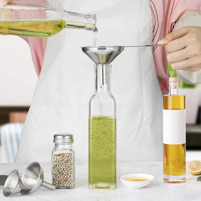 Each stainless steel funnel has a perfectly narrow handle that is ideal for filling small bottles and containers while the kitchen table stays spilled.