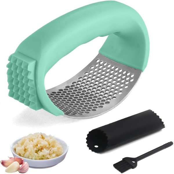 Stainless Steel Garlic Presser, 1Pc Garlic Press Rocker Garlic Mincer Garlic Crusher with Peeler and Brush,Stainless Steel Garlic Press Rocker,Stainless Steel Garlic Press Rocker Garlic Crusher,Green