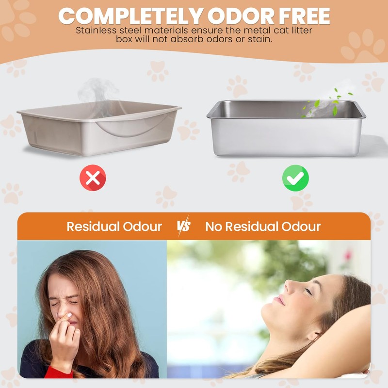 - Stainless aluminum cat litter box - Made of rust and stain resistant aluminum alloy, this litter box does not absorb odor and is perfect for both indoor and outdoor use