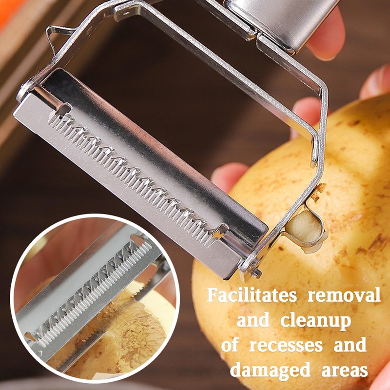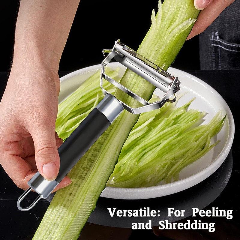 - 1.【Multifunctional Double-Sided Design for Versatile Use】This stainless steel peeler features a 2-in-1 double-sided blade, making it a kitchen workhorse. It effortlessly handles peeling fruits (like apples, pears), melons (watermelon, cantaloupe), and potatoes, while the dedicated side enables quick and even shredding—saving time on meal prep for salads, stir-fries, and more
