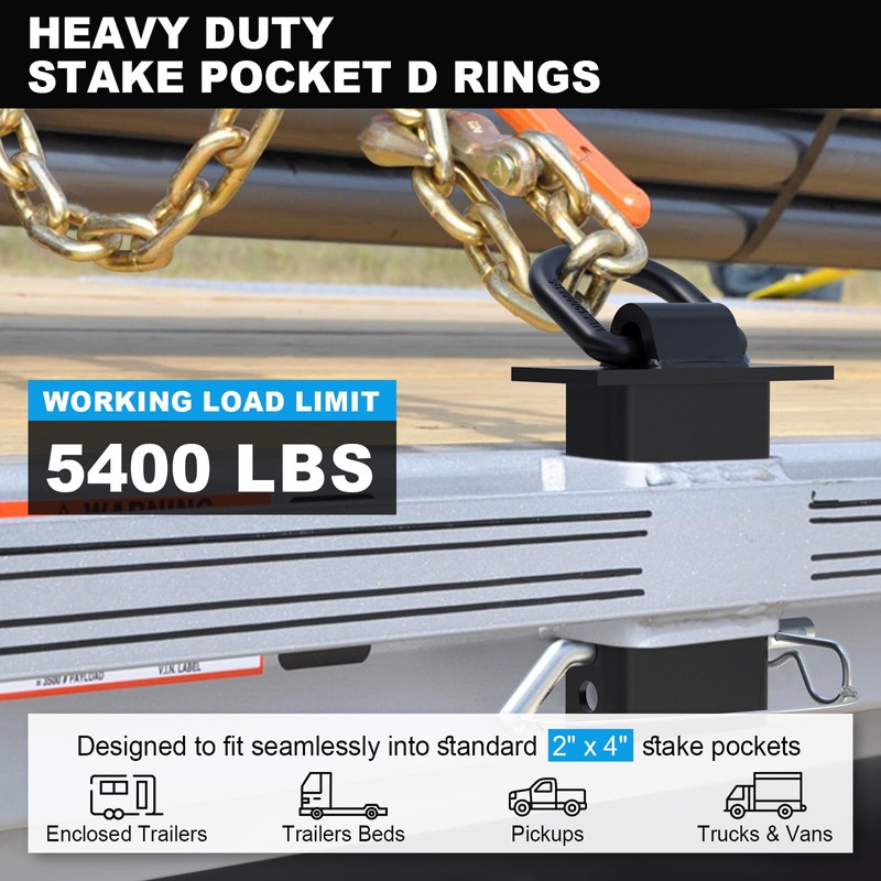- 【Wide Application】Our stake pocket tie down rings fit all 2“x4" standard stake pockets. This d rings for trailers are designed for various trailer and cargo securing needs,flatbed, trailer, trucks,winches etc. Just be sure to measure before you buy to ensure a snug fit.
