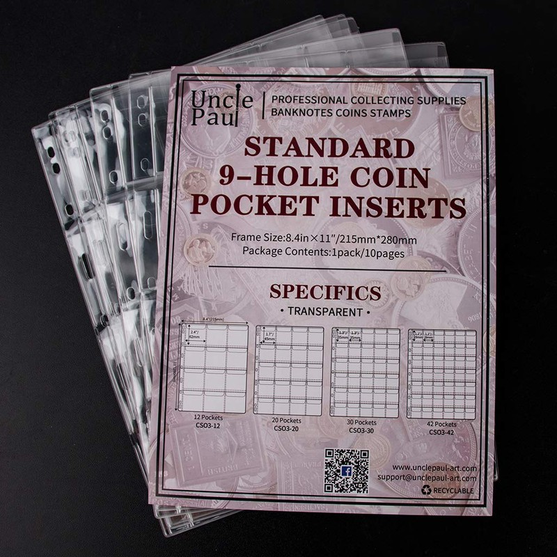 • Product Specifications - 10 sheets, 60 pockets, 6 pockets/sheet. Page Size: 28.0cm x 21.0cm/11.0in x 8.3in, Pocket Size: 97 x 82mm/3.82 x 3.23in. Fits commemorative coins, badges, medallions, tokens, tickets, etc.