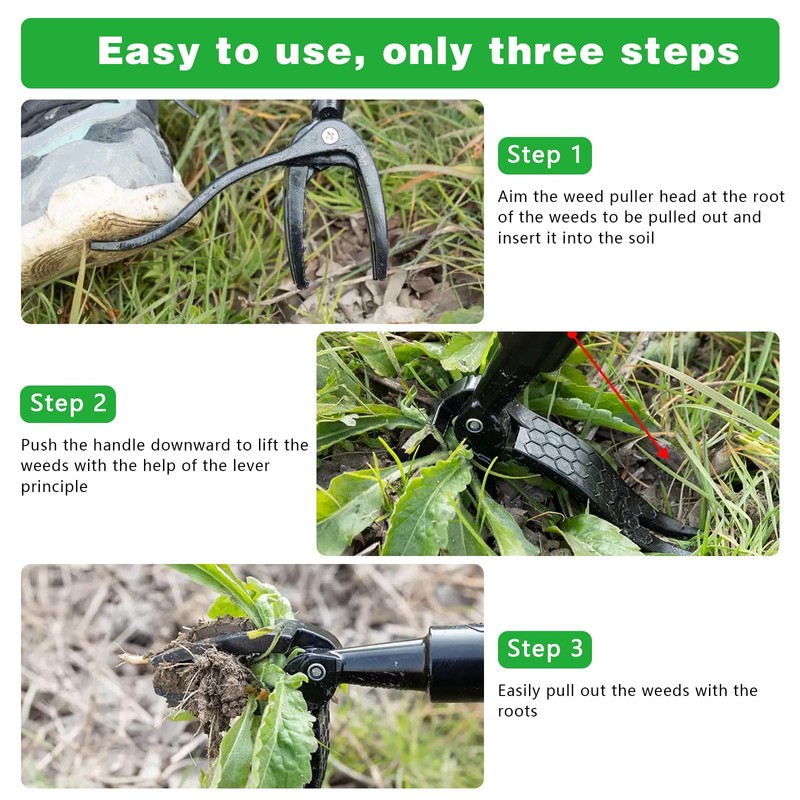- 【4-Claw Stainless Steel Grip – Root Out Weeds Forever】 Patented sharpened stainless steel claws dig deep to extract weeds root-and-all, including stubborn dandelions, crabgrass, and thistle. The reinforced foot pedal adds extra leverage for rocky or compacted soil—stop regrowth at the source.