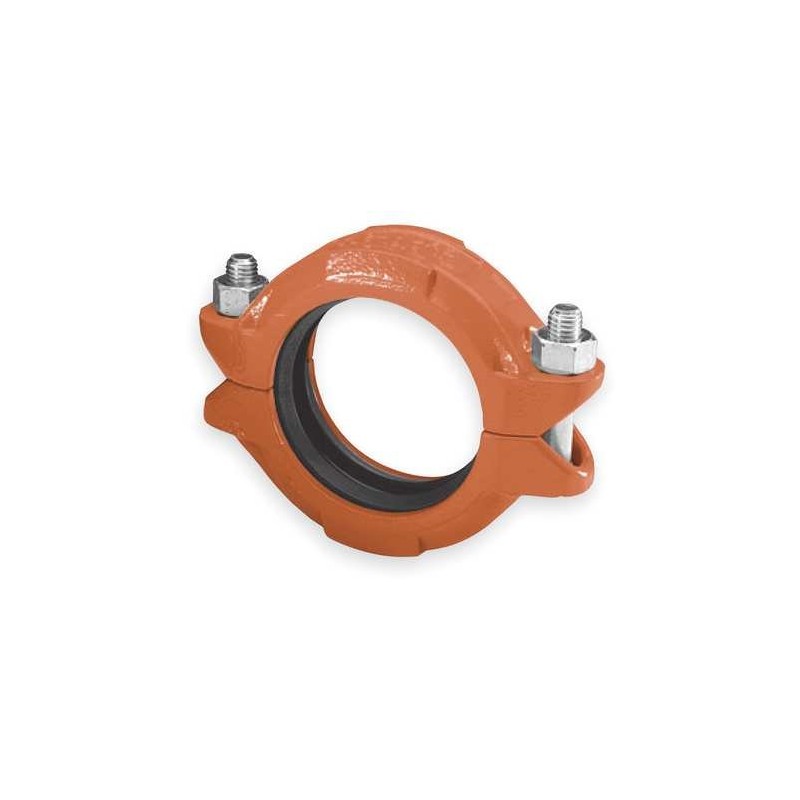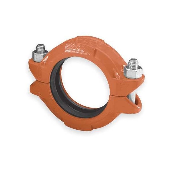 ' Standard Coupling, Nominal Size 4 In., Connection Type Grooved, Body Material Ductile Iron, Max. Pressure 1000 psi, Gasket Material EPDM, Bolt Size 5/8 In. x 3-1/2 In., Temp. Range -40 Degrees to 250 Degrees F, Max. Load 11, 928 lb., Pipe End Separation 0 In. to 1/4 In., Fits Pipe O.D. 4-1/2 In., Color Orange, Standards ASME B31.1, B31.9, ASTM A536, NFPA 16 '