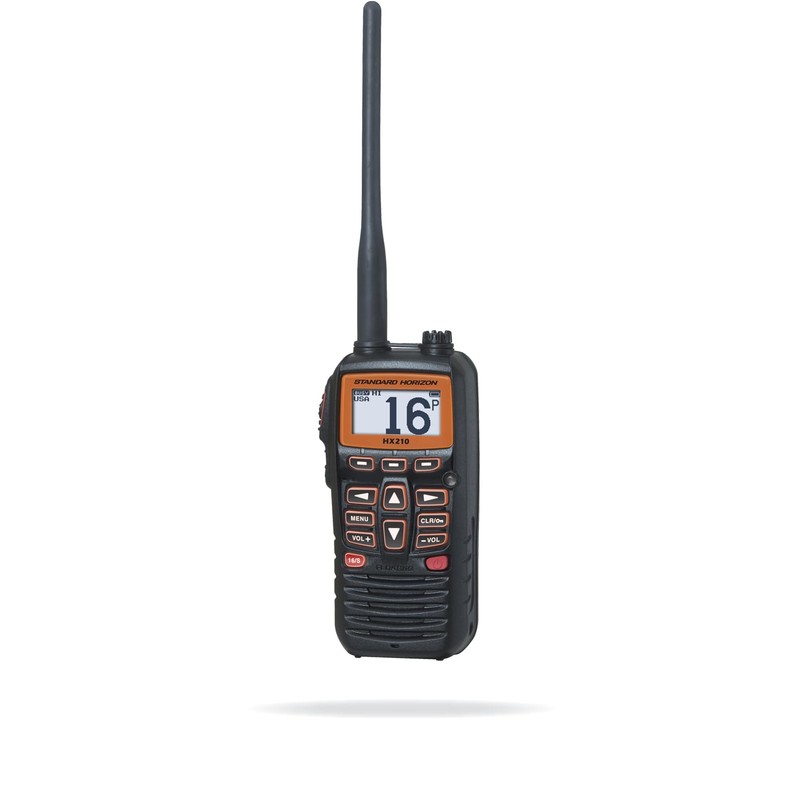 The HX210 is a VHF handheld device for marine use. The device is submersible, floats and has 6 watts of power. The radio has assigned all channels of the USA, International or Canadian as well as Emergency Channel 16.
