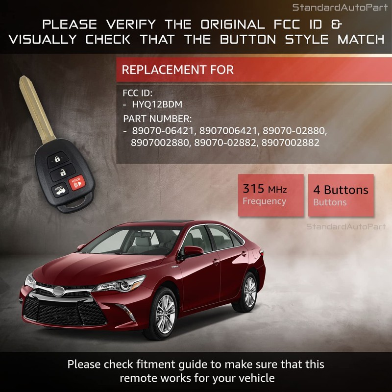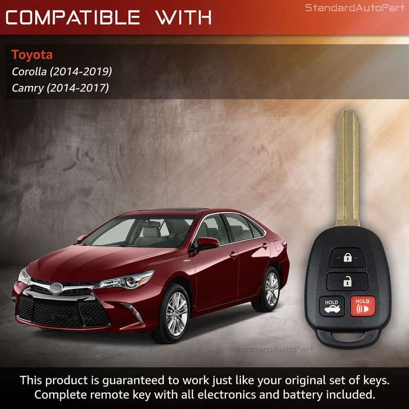 - [Important note] Corolla and Camry feature three remote controls that look alike but contain distinct electronics. Prior to purchasing, kindly verify the FCC number located on the back of your remote.