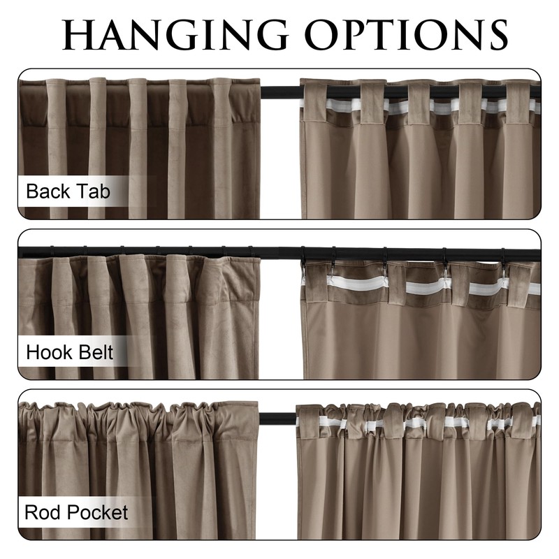 - Ready Made: Sold as 52" width by 120" length per panel(104" wide in total). The package includes 2 panels of velvet curtains with back tab & hook belt & rod pocket top style. All the hanging options can help you create different looks easily.