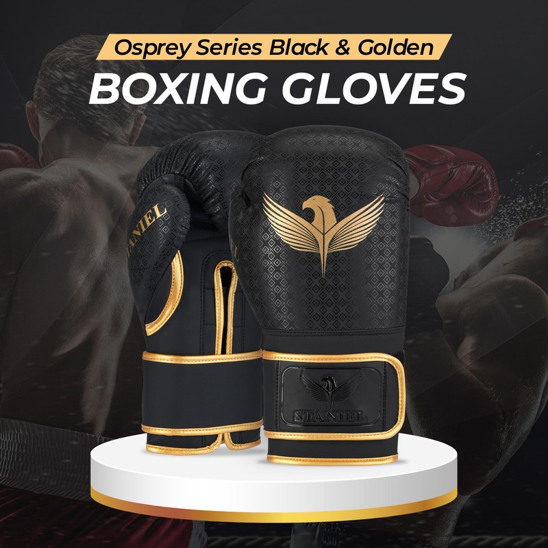 Staniel Osprey Series Boxing Training Gloves - Synthetic Leather with Long Injected Foam Padding, Foam-Lined Satin Interior for Comfort, Includes Free Mesh Backpack (Black/Golden 12 oz 1 Pair)