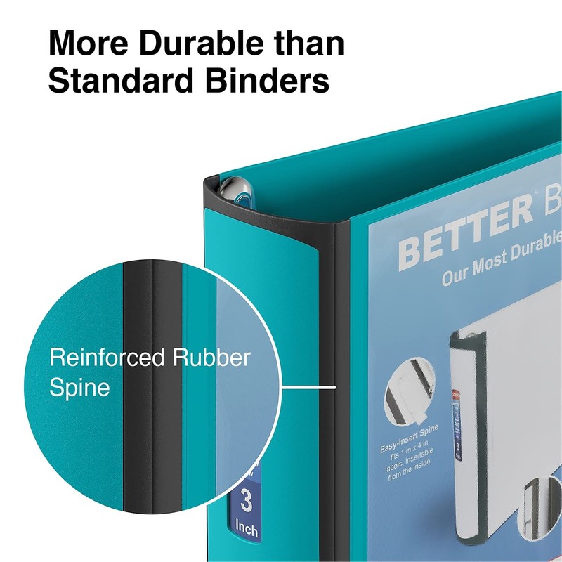 Compile reports, forms and log sheets in this Staples Better teal 3-inch three D-ring view binder. Create a central location for all your daily paperwork with this Staples Better view binder. The 600-sheet capacity offers ample file storage for quarterly reports, compliance paperwork or reference materials, and the nonstick materials prevent toner and ink from lifting off the pages. This Staples Better view binder features clear windows and an index label insert so you can customize the look with title pages, images and labels.