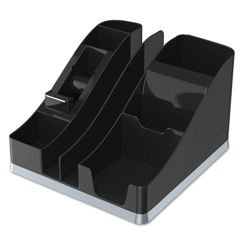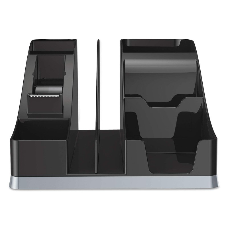 Deflecto All-in-one desk organizer in black color features 6 compartments to accommodate various items making it a perfect appliance for people working in restricted areas. Deflecto All-in-one desk organizer made of plastic holds one roll of tape, note pad, files and other desktop items. Desk organizer measuring 5 1/4" x 7 7/8" x 9 1/4" has space for small electronic charger and includes a removable divider for files.
