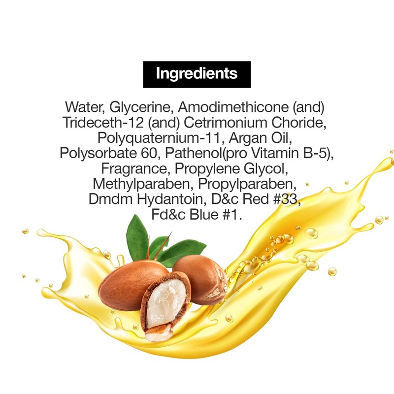 - Ingredients: Water, Glycerine, Amodimethicone (and) Trideceth-12 (and) Cetrimonium Choride, Polyquaternium-11, Argan Oil, Polysorbate 60, Pathenol(pro Vitamin B-5), Fragrance, Propylene Glycol, Methylparaben, Propylparaben,dmdm Hydantoin, D&c Red #33, Fd&c Blue #1.