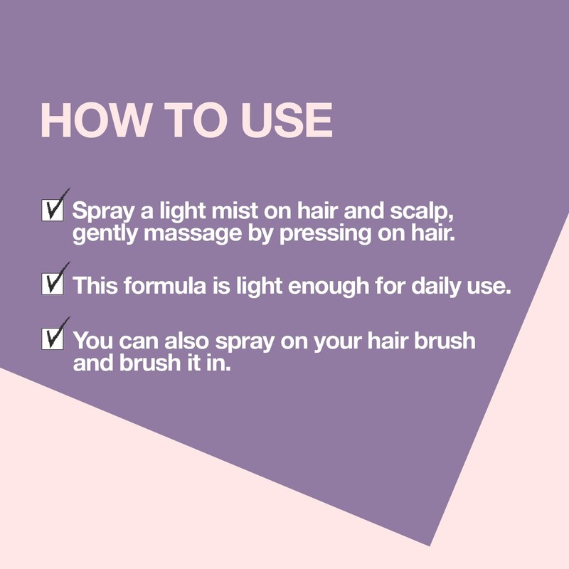 - Spray a light mist on hair and scalp, gently massage in by pressing on hair.