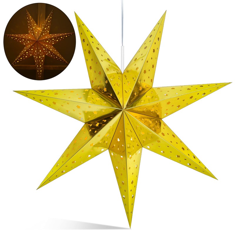 Star Paper Lantern 7 Pointed Star Paper Lantern with 10 LED Light String Hanging Pendant Lampshade Christmas Ornament for Christmas Weddings Holiday Birthday Home Decor 19.7 Inch (Gold)