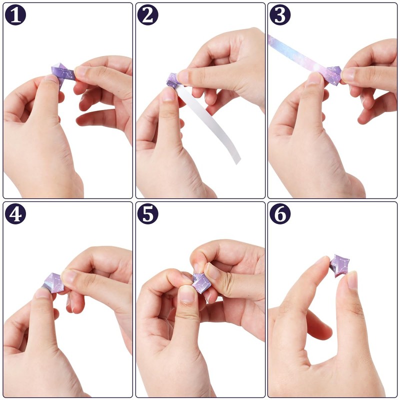 - Easy to fold: 1. Knot one end of the paper strip; 2. Wrap until the tape is almost used up; 3. Stuff the remaining paper strips into the gap; 4. Squeeze each side of the origami paper to shape a star.