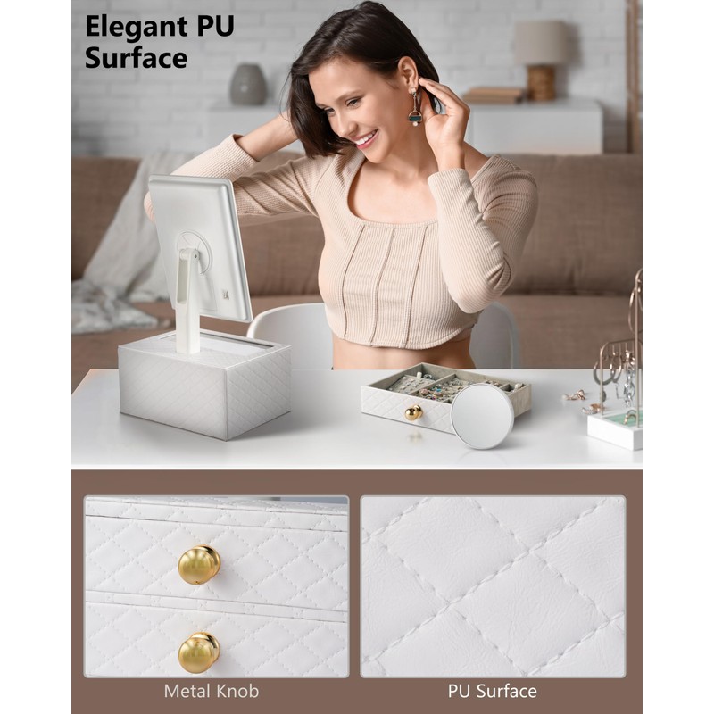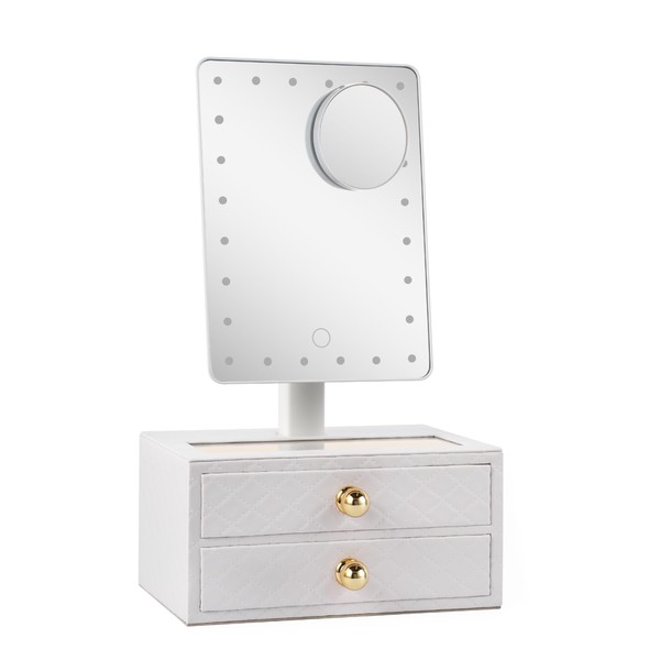 Star Vision 2-in-1 Lighted Makeup Mirror with PU Jewelry Organizer, Dimmable 6,000K Cool White Light, 2-Layer Drawers, PU Surface with Stitching, Includes a 10X Magnification Mirror, White