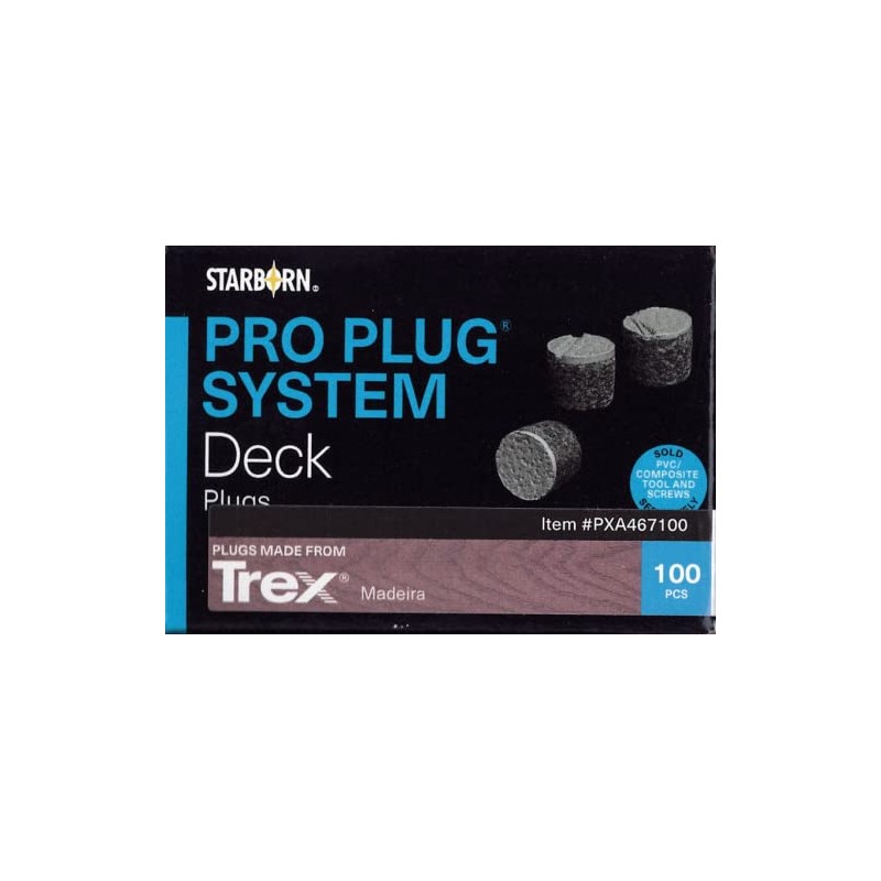 - 100 Plugs to cover 100sq ft of Trex Madeira decking. Photo of packaging is generic. Swatch is a color of Madeira decking.