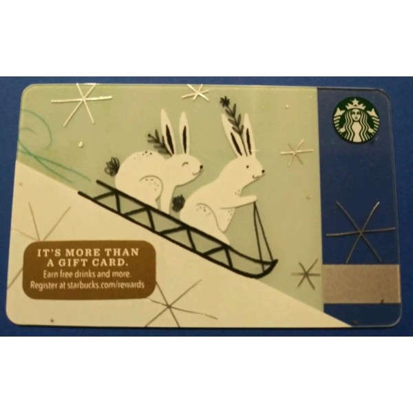 Add a rare and cute Starbucks Card to your collection with this 2017 "Rabbits Sledding" design. Perfect for coffee and tea enthusiasts, this card features adorable rabbits sledding and is in brand new condition. Use it to add value to your Starbucks Card collection or as a thoughtful gift for a fellow coffee lover. The card has not been modified and is the perfect addition to any collection. No value.