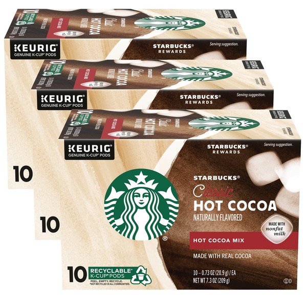 Indulge in the rich and creamy flavor of Starbucks Hot Cocoa, made with real cocoa and naturally flavored. Specially crafted for your Keurig machine, these K-Cup pods offer a convenient way to enjoy a delicious cup of hot chocolate at any time. Each pack contains 10 recyclable K-Cup pods, and this listing includes three packs, totaling 30 pods. Perfect for a cozy treat during chilly days or a delightful everyday indulgence.