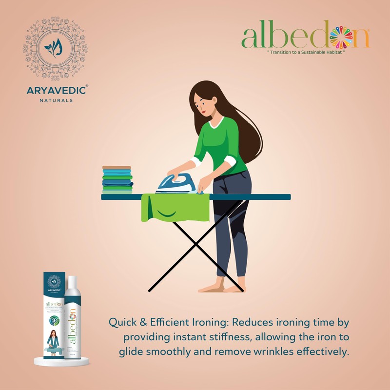 - Versatile Use- Albedon Instant Fabric Ironing Stiffener Spray is perfect for everyday clothing, home textiles, and crafting projects. Albedon helps reduce greenhouse gas emissions during manufacturing and use. Its nano-coating applied to fabrics captures dirt and pollutants, allowing for easier washing with less detergent, thus minimizing environmental impact. Additionally, the coating actively converts greenhouse gases, enhancing its eco-friendly benefits. Albedon also prioritizes sustainability by using eco-friendly packaging and filling methods, avoiding liquid propellants and harmful gases for a safer product.