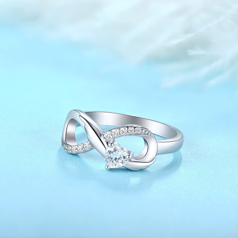 - Material: Angel Wings Heart Infinity Ring. Made of 925 sterling silver and rhodium plated . Setting with 10 AAA cubic zirconia stones and a 4 mm heart-shaped cubic zirconia