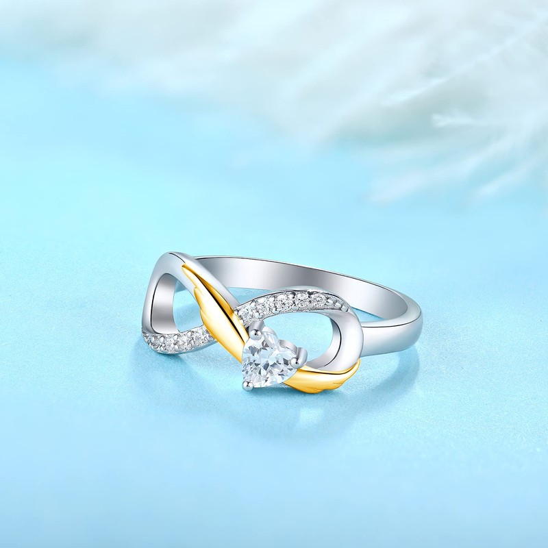 - Material: Angel Wings Heart Infinity Ring. Made of 925 sterling silver and 18k gold. Setting with 10 AAA cubic zirconia stones and a 4 mm heart-shaped cubic zirconia