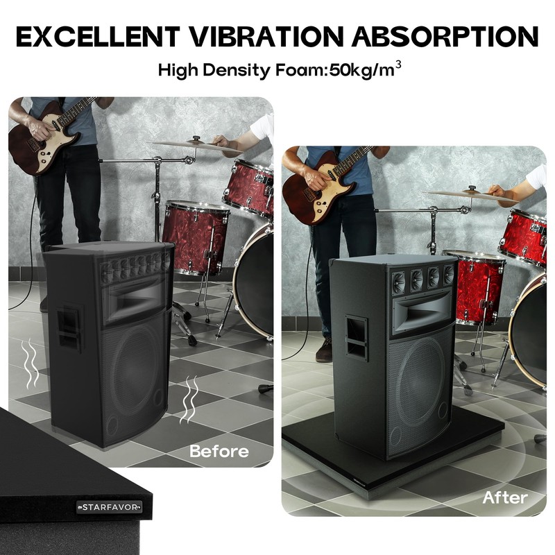 • Compatible with 12"-15"Subwoofers: The sound dampening riser platform pad is perfectly compatible with a wide range of audio equipment. Compatible with all 12"-15" studio monitors, subwoofers and speakers. Vibration mat optimizes the sound clarity and performance of all compatible devices. Perfect for enhancing professional studios, home theaters, live show.