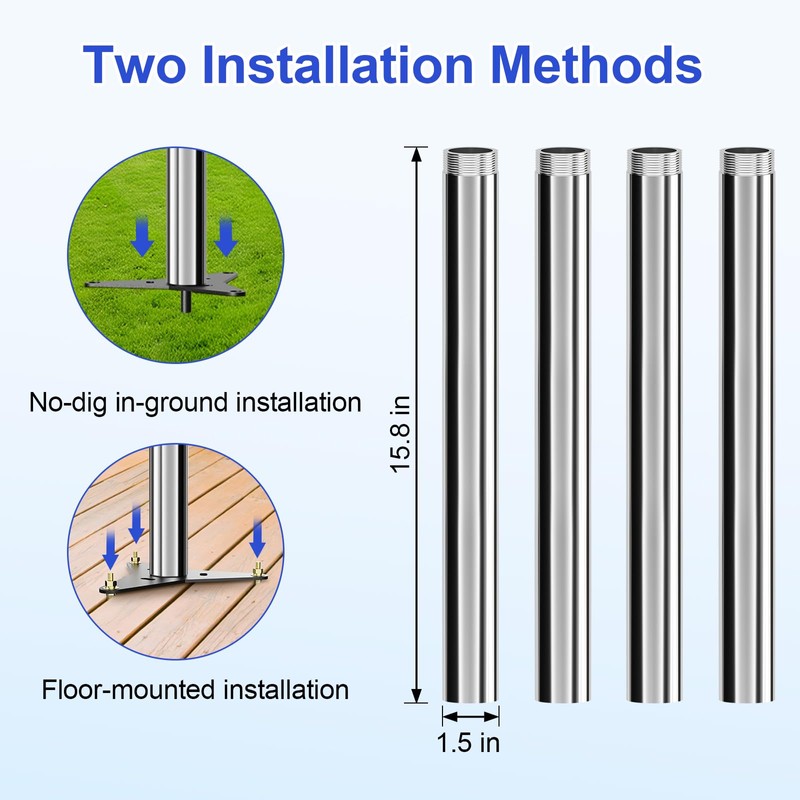 - Unique Ground Plug Design:The bracket is designed with no-digging ground anchors and a widened triangular chassis, which can easily fix the pole on the ground and at the same time enhances the stability of the bracket, providing strong support even in bad weather