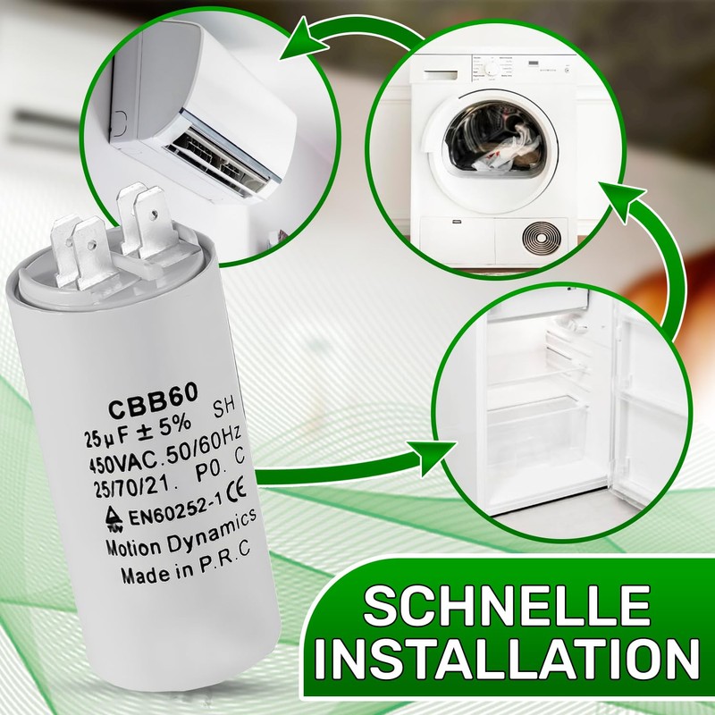 - Application - This capacitor with 25µF and 450V provides the required starting torque for single-phase AC motors and is therefore ideal for applications such as air conditioners, refrigerators, washing machines, pumps and other similar devices.