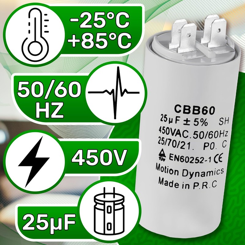 - Compatibility: CBB60 capacitor with capacity of 25µF is a versatile component that is suitable for a variety of applications in household appliances, engine start, power factor correction, lighting ballasts and power supplies.