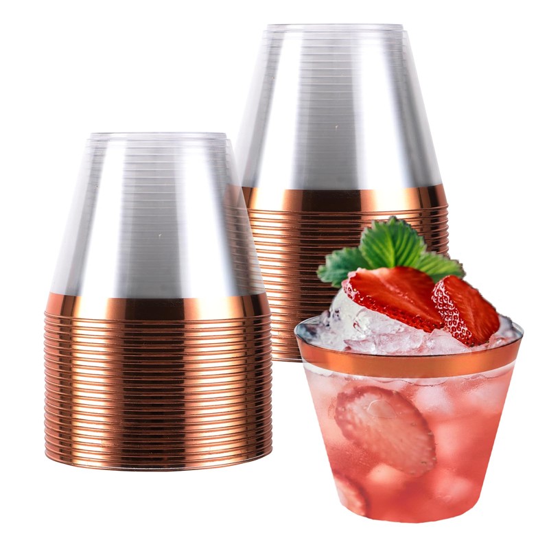 STARVAST Pack of 60 Plastic Cups, 260 ml/9 oz Reusable Transparent with Rose Gold Rim Drinking Cup for Home Decoration, Party, Wedding, Birthday, Camping, Picnic